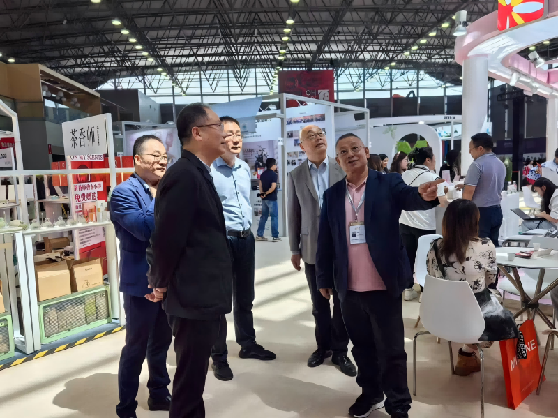 在今年新设立的香水香氛展区,毛祥东先后来到法国罗伯特、格拉斯花宫娜、广东铭康等企业展位,听取企业新技术、新原料、新产品的介绍,了解香水香氛产业发展趋势,并和我校产学研合作企业广东铭康香精香料有限公司董事长吴焕清进行深入交流。